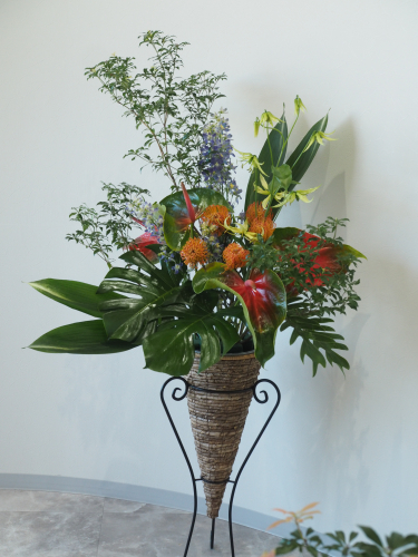 今回は、パッと目を引く大きなアンスリウムをメインに据えたアレンジメントです。